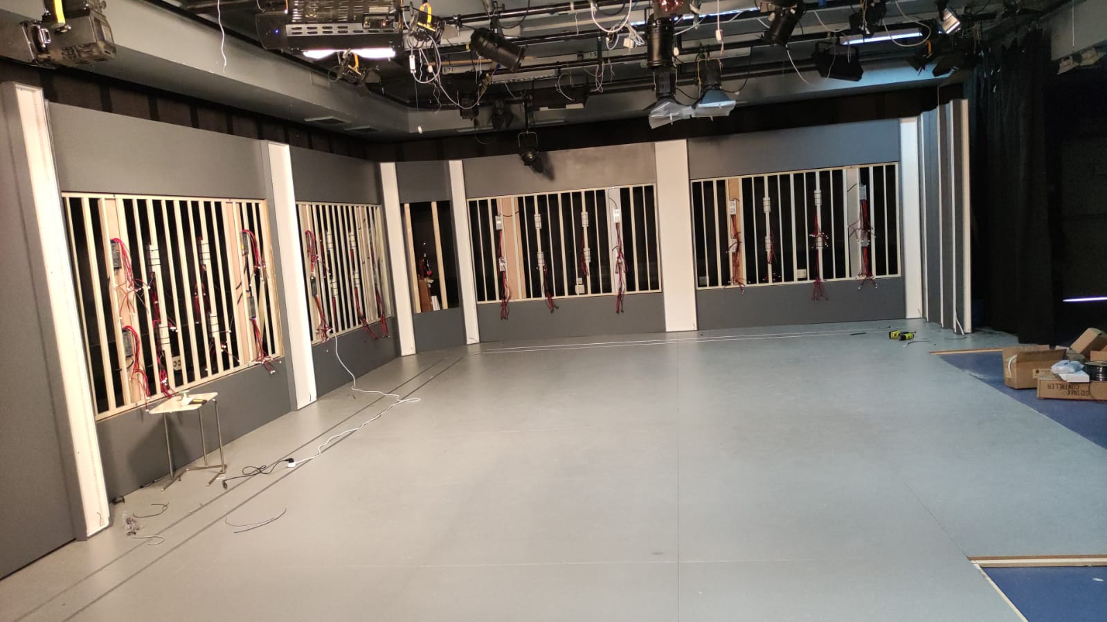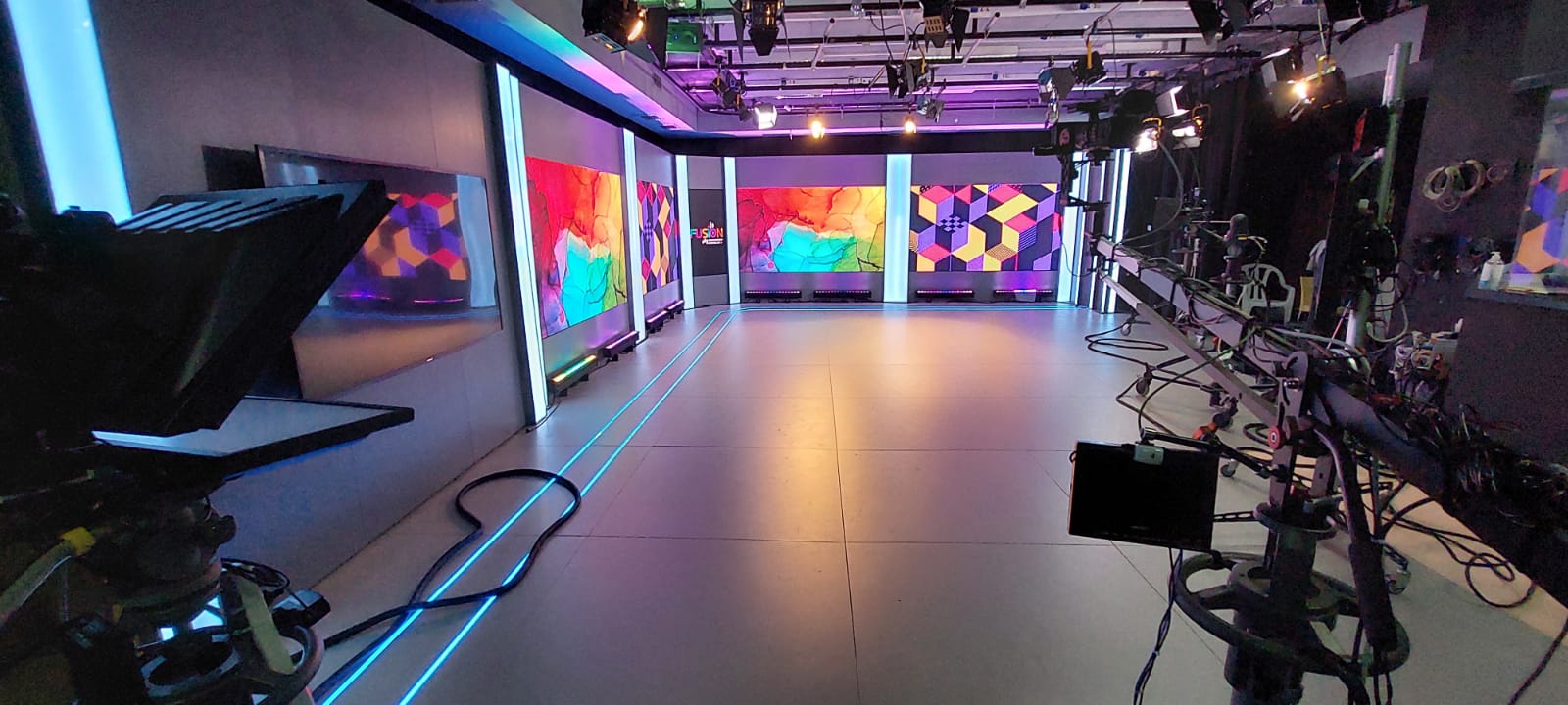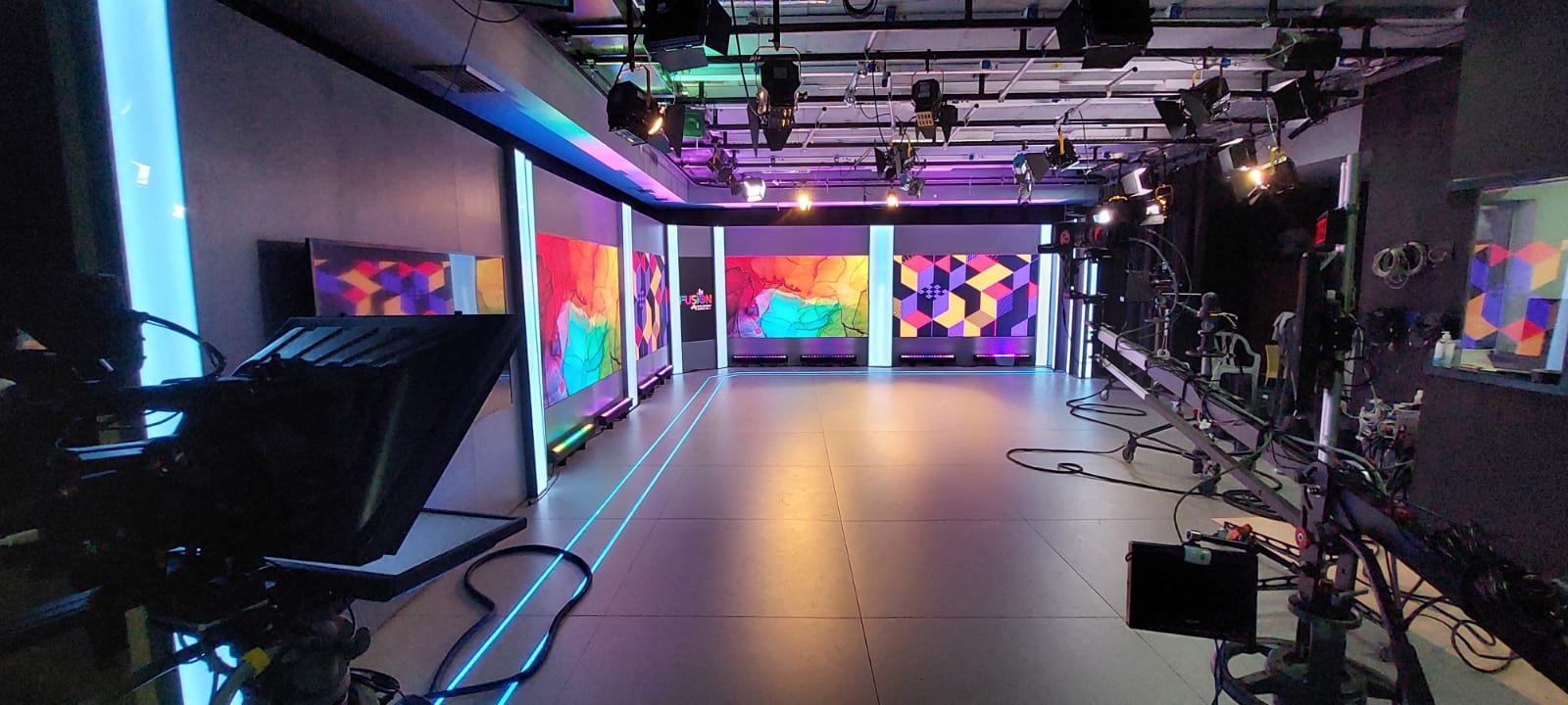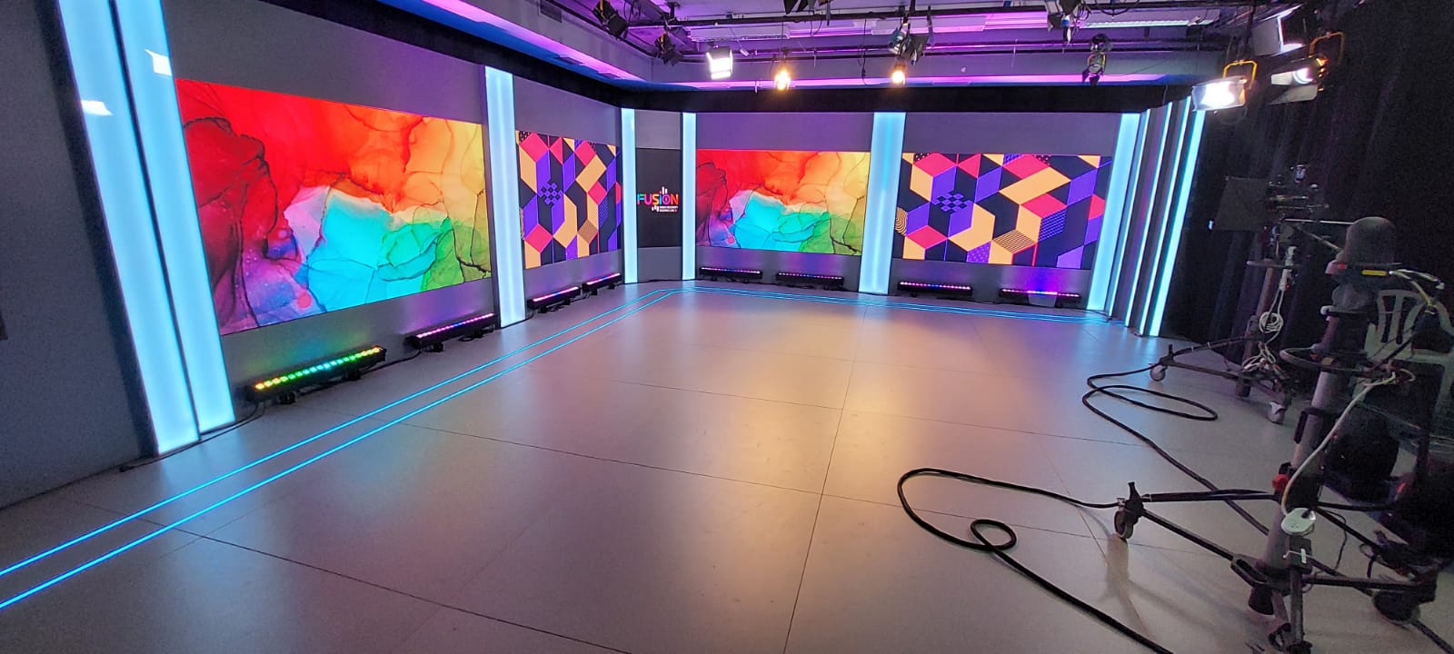 תכנון והקמת תפאורת תאורה באולפן טלוויזיה עם מערכת תאורת לד שליטה DMX, פסי תאורת לד שקועה ברצפה ופסי תאורת לד בקוליסות על גבי התפאורה.